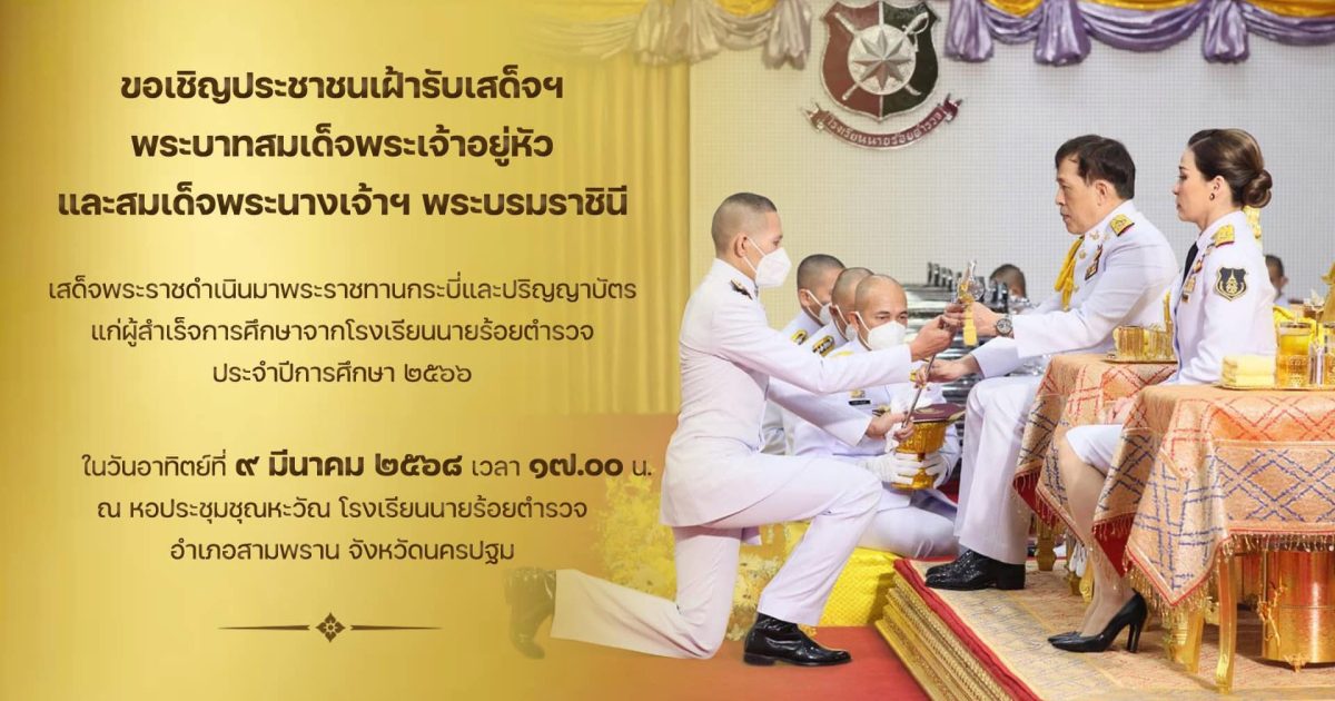 ขอเชิญประชาชน ร่วมเฝ้าทูลละอองธุลีพระบาทรับเสด็จ พระบาทสมเด็จพระเจ้าอยู่หัว และสมเด็จพระนางเจ้าฯ พระบรมราชินี เนื่องในโอกาสเสด็จพระราชดำเนินมาพระราชทานกระบี่และปริญญาบัตรแก่ผู้สำเร็จการศึกษา จากโรงเรียนนายร้อยตำรวจ ประจำปีการศึกษา 2566