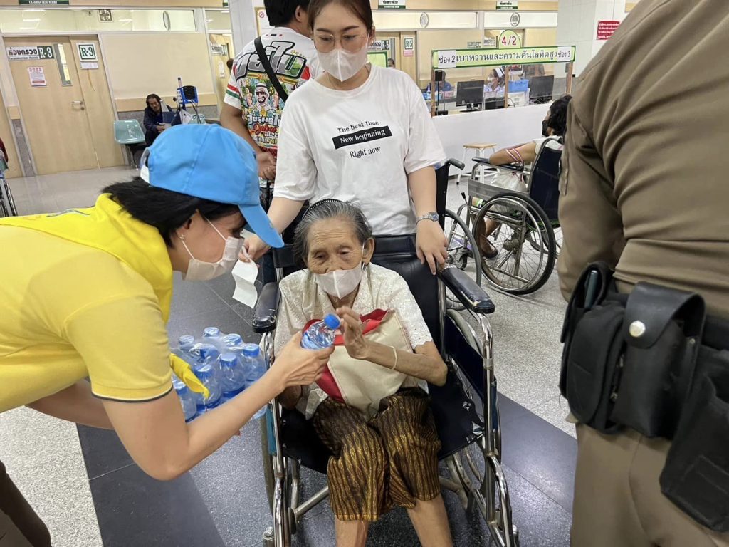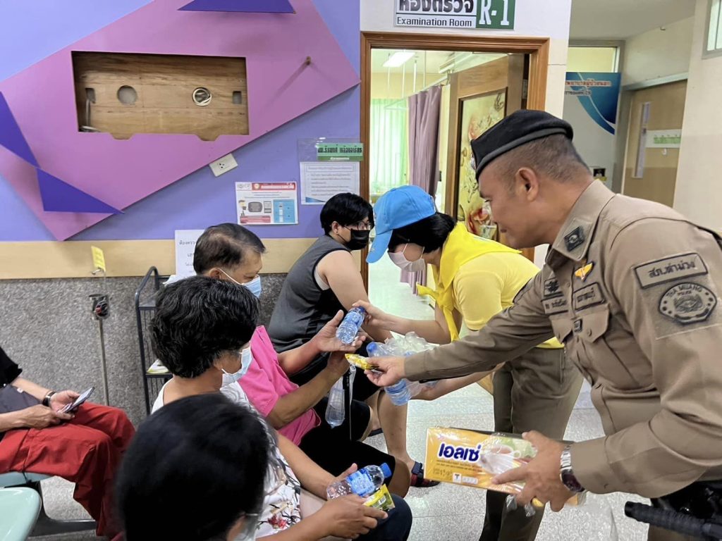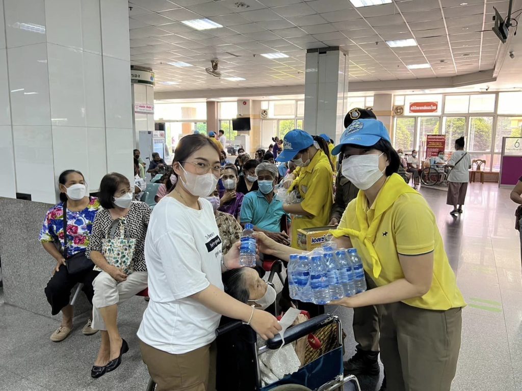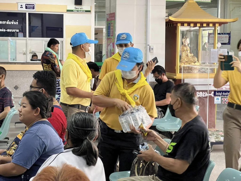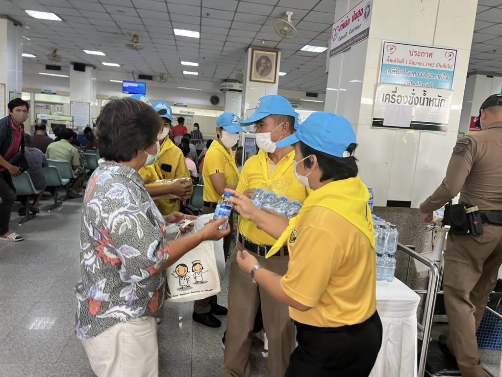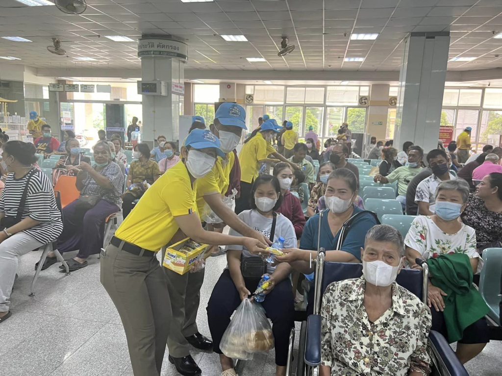 จิตอาสามอบน้ำและขนมให้กับประชาชนและผู้ป่วยที่มารอพบแพทย์ ณ โรงพยาบาลสมเด็จพระสังฆราชองค์ที่ 19