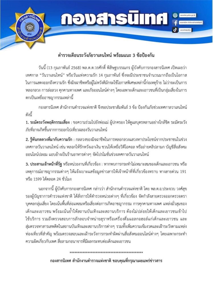 กองสารนิเทศ สำนักงานตำรวจแห่งชาติ จึงขอประชาสัมพันธ์ 3 ข้อป้องกันภัยช่วงเทศกาลวาเลนไทน์ ดังนี้