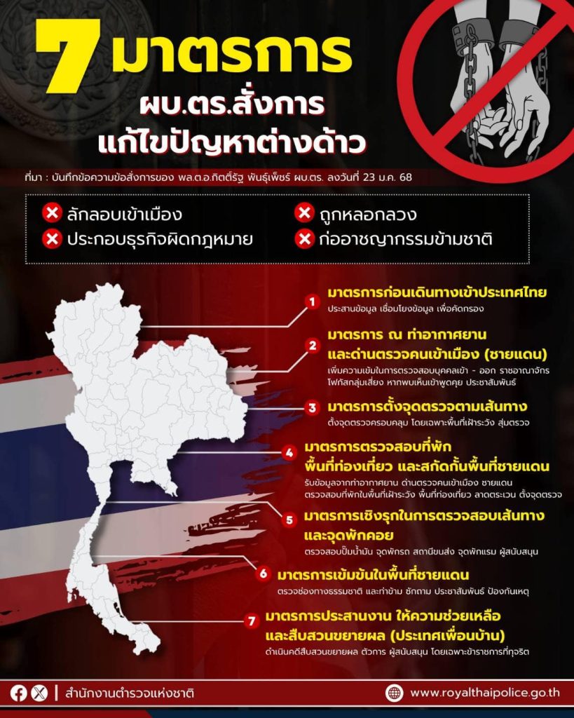 วันนี้ (25 มกราคม 2568) พล.ต.อ.กิตติ์รัฐ พันธุ์เพ็ชร์ ผู้บัญชาการตำรวจแห่งชาติ เปิดเผยว่า สำนักงานตำรวจแห่งชาติมุ่งมั่นในการแก้ไขปัญหาคนต่างด้าวที่หลบหนีเข้าเมืองโดยผิดกฎหมาย คนต่างด้าวตั้งกลุ่มแก๊งกระทำความผิดหรือประกอบธุรกิจผิดกฎหมาย และอาชญากรรมข้ามชาติ อย่างเต็มกำลัง เพื่อขจัดปัญหาเหล่านี้ให้หมดไปโดยเร็ว จึงได้มีหนังสือสั่งการเน้นย้ำให้หน่วยปฏิบัติที่เกี่ยวข้อง บังคับใช้ 7 มาตรการ อย่างเข้มงวด ในการป้องกันและแก้ไขปัญหา ได้แก่