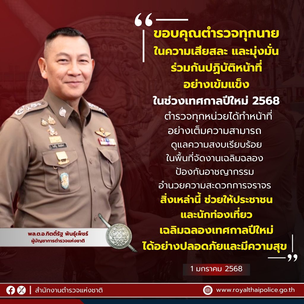 เมื่อวันที่ 1 มกราคม 2568 พล.ต.อ.กิตติ์รัฐ พันธุ์เพ็ชร์ ผู้บัญชาการตำรวจแห่งชาติ กล่าวว่า ขอชื่นชม และขอบคุณเจ้าหน้าที่ตำรวจทุกนายทั่วประเทศ ในความเสียสละและความมุ่งมั่นร่วมกันปฏิบัติหน้าที่อย่างเข้มแข็งในช่วงเทศกาลปีใหม่ 2568 โดยเจ้าหน้าที่ตำรวจทุกหน่วยได้ทำหน้าที่อย่างเต็มความสามารถ ทั้งการดูแลความสงบเรียบร้อยในพื้นที่จัดงานเฉลิมฉลอง การป้องกันอาชญากรรม และการอำนวยความสะดวกด้านการจราจร สิ่งเหล่านี้ช่วยให้ประชาชนและนักท่องเที่ยวสามารถเฉลิมฉลองเทศกาลปีใหม่ได้อย่างปลอดภัยและมีความสุข