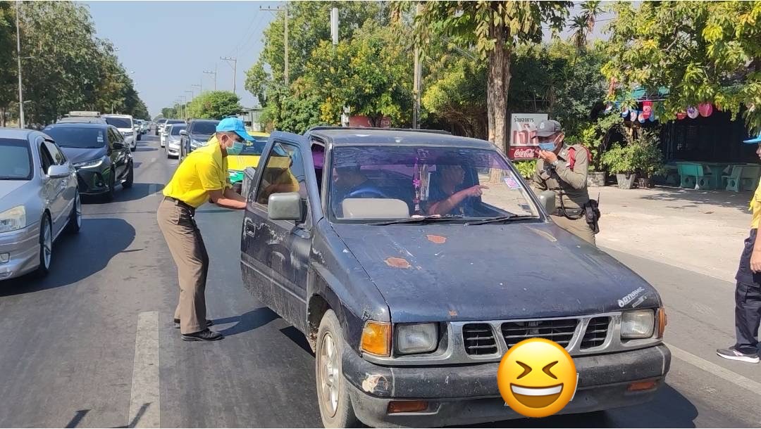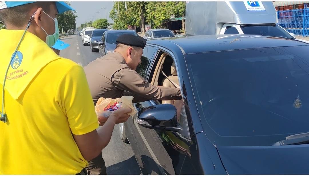 แก่ประชาชนที่เดินทางผ่านแยกสัญญาณไฟหนองเสือ อ.ท่าม่วง จ.กาญจนบุรี เพื่อเดินทางกลับ กทม.