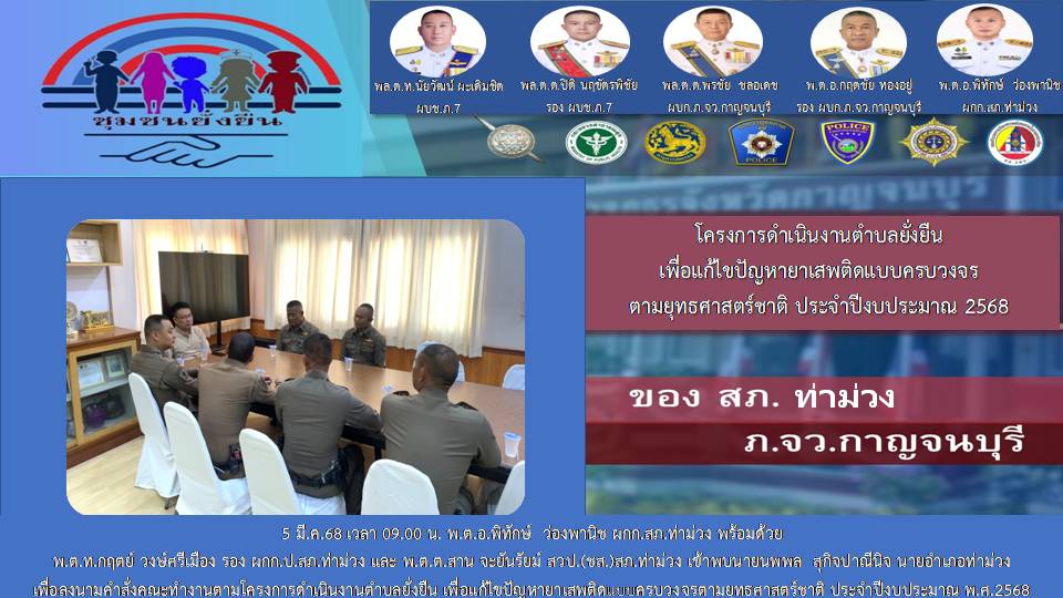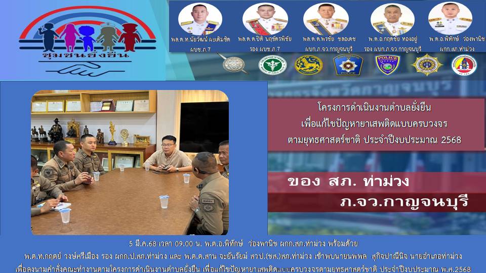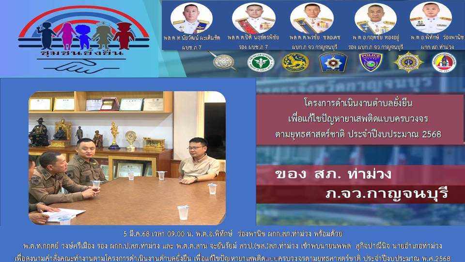 วันที่ 5 มี.ค.68 เวลา 09.00 น. พ.ต.อ.พิทักษ์ ว่องพานิช ผกก.สภ.ท่าม่วง พ.ต.ท.กฤตย์ วงษ์ศรีเมือง รอง ผกก.ป.สภ.ท่าม่วง ว่าที่ พ.ต.ต.อนุ วังขนาย สวป.สภ.ท่าม่วง ว่าที่ พ.ต.ต.สาน จะยันรัมย์ สวป.(ชส.)สภ.ท่าม่วง เข้าพบ นายนพพล สุกิจปาณีนิจ นายอำเภอท่าม่วง ได้เสนอคำสั่งแต่งตั้งคณะทำงานโครงการดำเนินงานตำบลยั่งยืน เพื่อแก้ไขปัญหายาเสพติดแบบครบวงจร ตามยุทธศาสตร์ชาติ ประจำปีงบประมาณ 2568