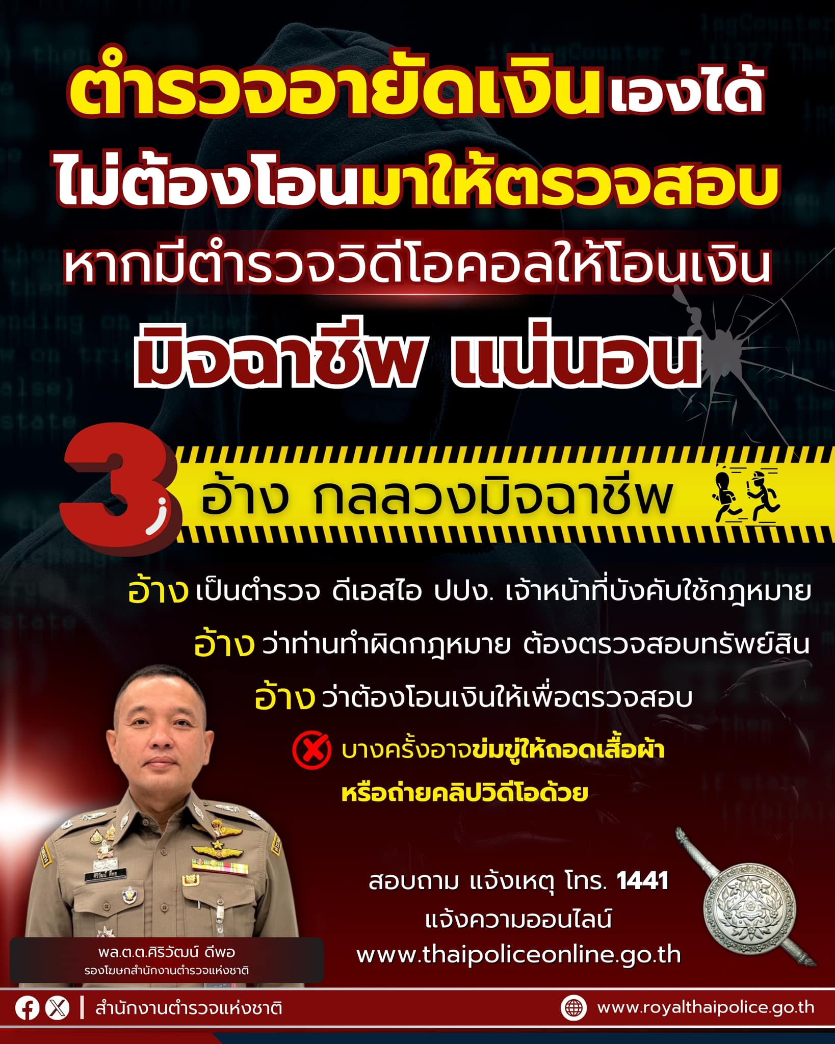 สำนักงานตำรวจแห่งชาติ ย้ำเตือน ตำรวจอายัดเงินเองได้ ไม่ต้องโอนมาให้ตรวจสอบ หากมีตำรวจวิดีโอคอลให้โอนเงิน มิจฉาชีพแน่นอน