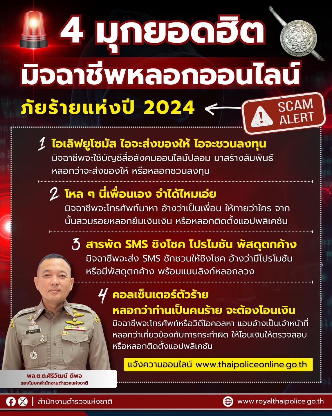 ตีแผ่ 4 มุกยอดฮิต มิจฉาชีพออนไลน์ ภัยร้ายแห่งปี 2024พล.ต.ต.ศิริวัฒน์ ดีพอ รองโฆษกสำนักงานตำรวจแห่งชา