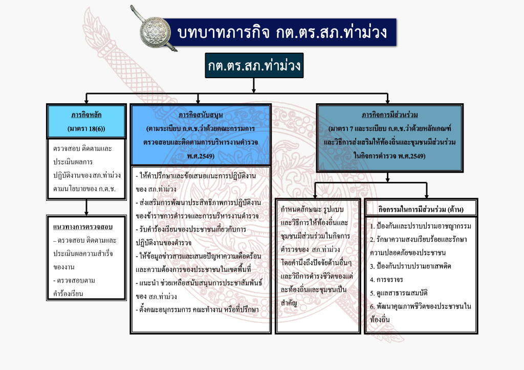 1. ภารกิจหลัก ตามมาตรา 18 (6 แห่ง พ.ร.บ.ตำรวจแห่งชาติ พ.ศ. 2547 กำหนดให้ กต.ตร.กทม. กต.ตร.จังหวัดและ กต.ตร.สถานีตำรวจ มีบทบาทภารกิจในการตรวจสอบ ติดตามและประเมินผลการปฏิบัติงานของ บช.น. / ภ.จว. ให้เป็นไปตามนโยบายของ ก.ต.ช. และการบริหารราชการตำรวจให้เป็นไปตาม พ.ร.บ.ตำรวจแห่งชาติ และกฎหมายอื่น ซึ่ง ก.ต.ช. ได้กำหนดอำนาจหน้าที่ของ กต.ตร.กทม,/จังหวัด และสถานีตำรวจในเรื่องดังกล่าว ไว้ในระเบียบ ก.ต.ช. ว่าด้วยคณะกรรมการตรวจสอบและติดตามการบริหารงานตำรวจ พ.ศ. 2549