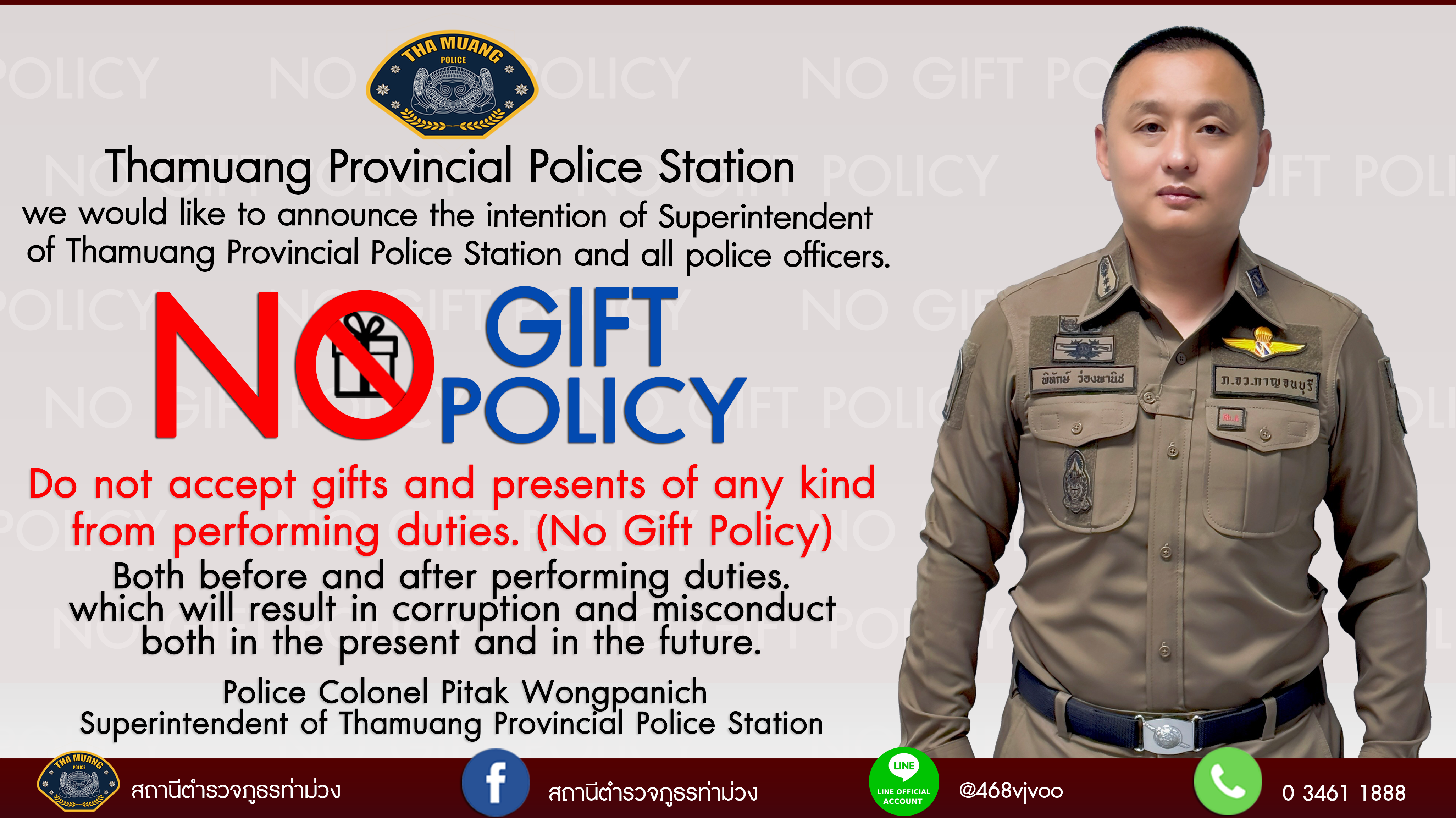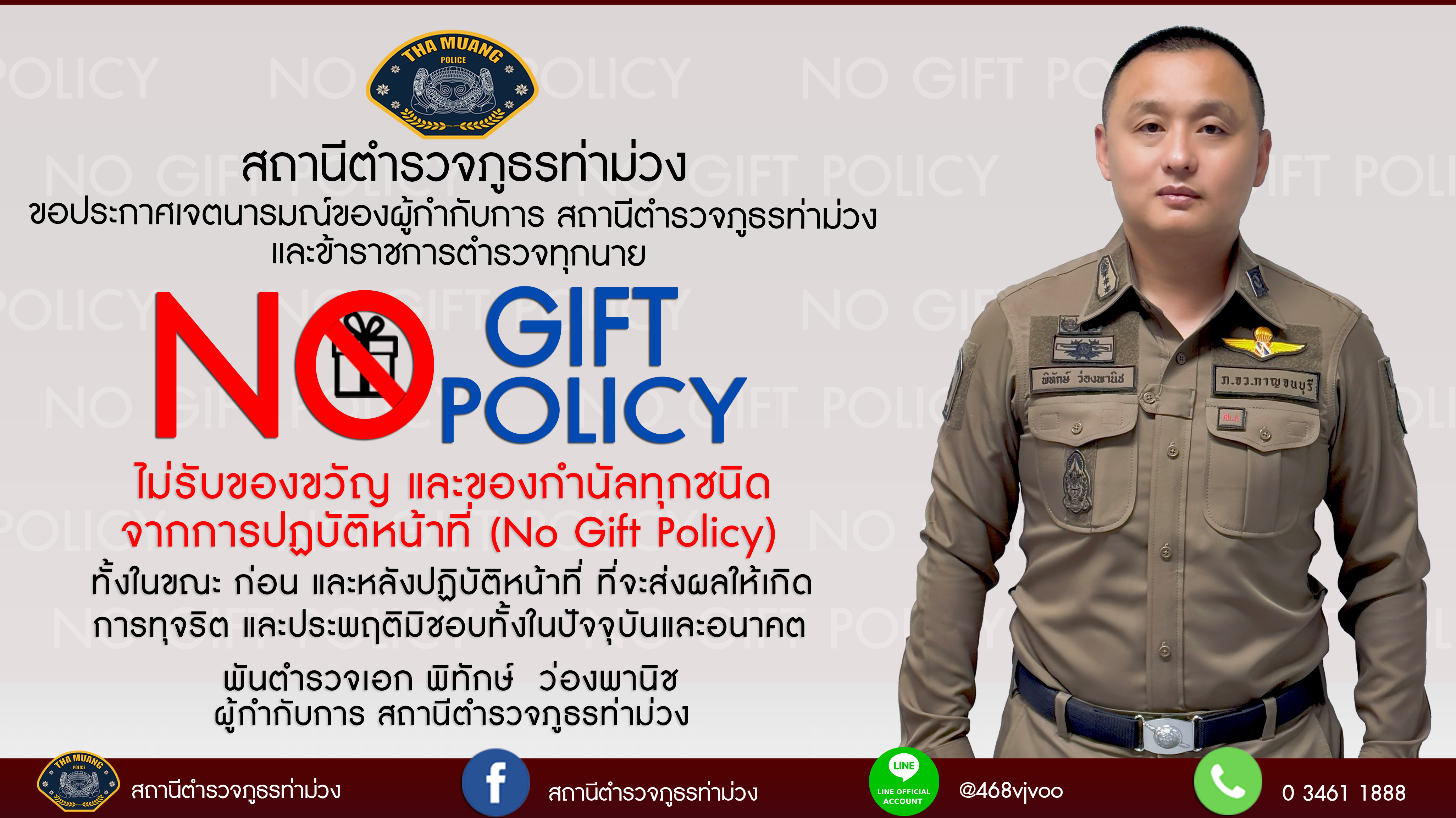 ประกาศนโยบายไม่รับของขวัญและของกำนัลทุกชนิด (No Gift Policy) จากการปฏิบัติหน้าที่